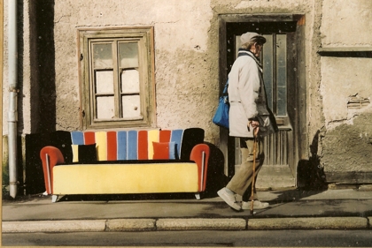 "Oma"sofa der 50er Jahre, mit grobem Kordstoff in frechen Farben bezogen
