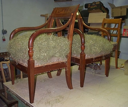 nach dem Schnüren wird auf Leinen das Afrik [natürliches Polstermaterial] aufgebracht